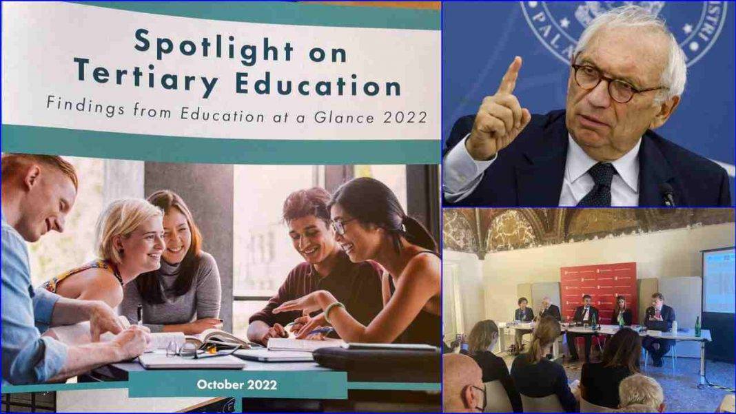 Il nuovo Report dell’OCSE “Education at a Glance 2022 – Uno sguardo sull’istruzione” è la principale fonte internazionale che ogni anno fornisce una comparazione delle statistiche nazionali sullo stato dell’istruzione nel mondo. Il rapporto analizza i sistemi educativi dei 38 paesi membri dell’OCSE, più Argentina, Brasile, Cina, India, Indonesia, Arabia Saudita e Sud Africa. Quest’anno il report ha presentato in più un capitolo sull’impatto del Covid-19 nei due anni scolastici passati e ha incluso in particolare la situazione universitaria internazionale. I dati OCSE sulla scuola italiana purtroppo sono sconcertanti: negli ultimi 20 anni abbiamo fatto dei passi indietro invece di andare avanti e siamo uno dei fanalini di coda tra i Paesi studiati dall’Organizzazione per la cooperazione e lo sviluppo economico. Dall’asilo nido all’Università i dati degli ultimi 20 anni ci dicono che la formazione dei giovani italiani è indietro su tutto. Dalla disparità di prestazioni territoriali, da Nord a Sud d’Italia, alla retribuzione netta dei nostri laureati, fino ai dati di disoccupazione e di abbandono scolastico.