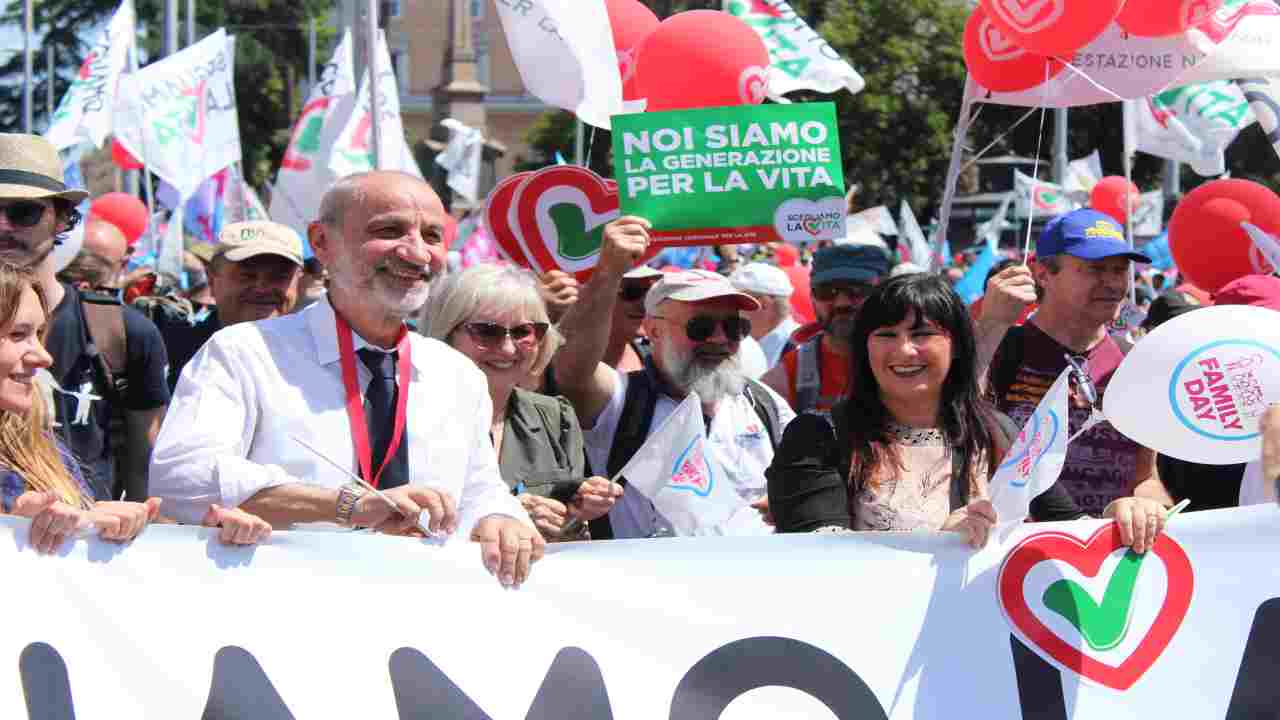 In piazza San Giovanni in Laterano, con sulla sfondo l’omonima basilica papale nota anche come cattedrale di Roma, i 40mila presenti si radunano davanti al palco su cui, introdotte dall’altra portavoce della manifestazione Maria Rachele Ruiu, tre donne e madri sono state testimoni di storie di maternità accolta, nonostante le difficili e persino dolorose situazioni che hanno attraversato, anche quando avevano la consapevolezza che quella vita sarebbe rimasta tra le loro braccia per poco tempo. C’è Giuliana, da Trento, accompagnata dal marito e dai cinque figli, che racconta come, alla sesta gravidanza, al concepito era stata diagnosticata la trisomia 21, nota come sindrome di Down, ed era stato definito “incompatibile con la vita”. Dopo un primo momento in cui aveva preso in considerazione l’ipotesi dell’interruzione volontaria di gravidanza, in seguito a diversi incontri la donna aveva poi deciso di portarla a termine. Il piccolo Karol nascerà purtroppo senza vita, “ma” – aggiunge Giuliana – “i suoi cinque fratellini sanno che c’è un angioletto che li proteggerà sempre”.