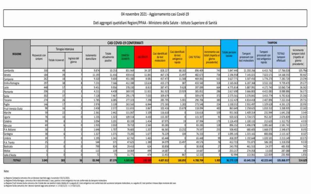 In un giorno sono stati effettuati 514.629 tamponi, tra molecolari e antigenici, meno degli oltre 700mila di 24 ore fa, col tasso di positività che è risalito dallo 0,7% all’1,1%.